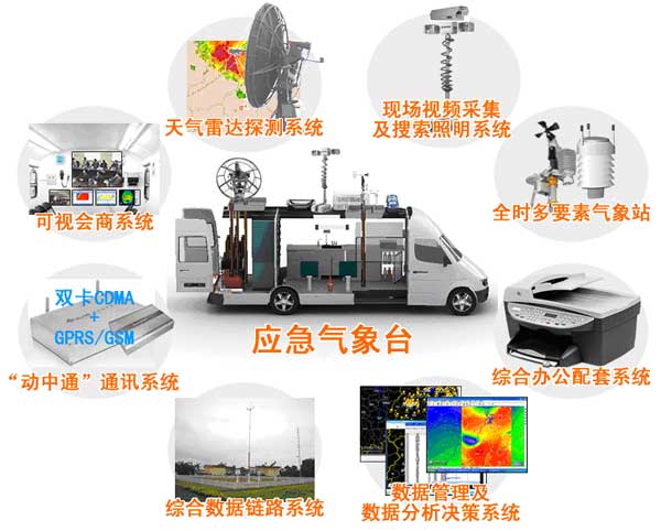 - 省、地、縣級系統建設。如:以新一代移動式天氣雷達為核心的綜合探測系統、決策指揮系統、通信網絡系統、效果評估系統,形成合理的業務流程;實施、信息快速傳遞、觀測資料收集。